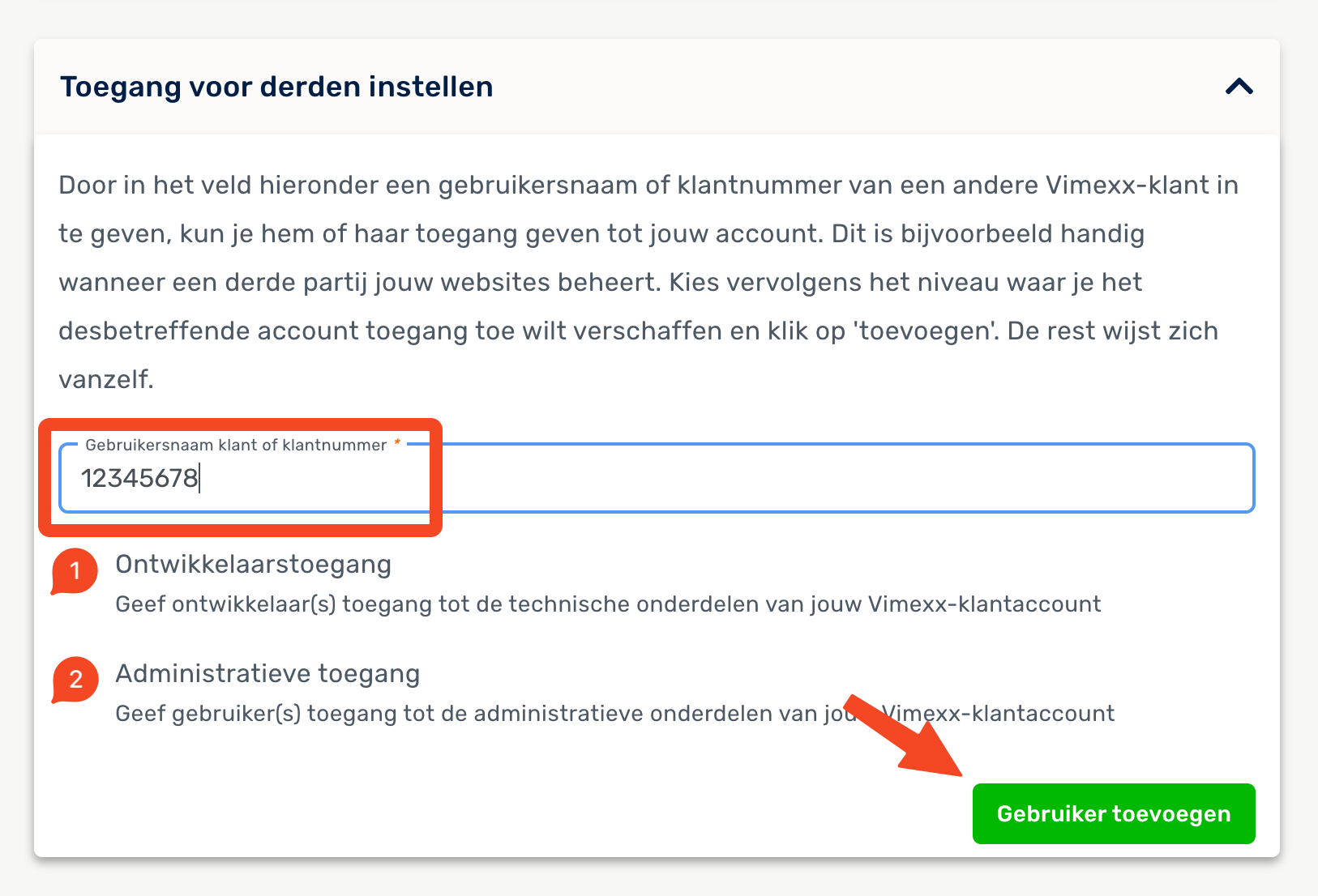 - Ontwikkelaars toegang - Het account kan jouw producten beheren, zoals het wijzigen van de DNS, inloggen op het hostingpakket of een domein koppelen. Deze persoon kan dus niet jouw betalingen, orders of bestellingen zien. - Adminstratieve toegang - Het account kan jouw bestellingen, betalingen en orders terug zien en beheren, maar krijgt geen toegang tot jouw producten.