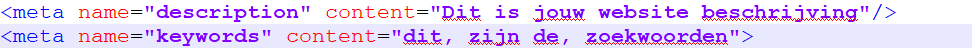 In HTML heb je enkele belangrijke tags, die wij de meta-tags noemen. Deze tags bewaren gegevens voor je, ze zijn onzichtbaar op de normale website, maar staan wel in de broncode van je pagina. Deze kunnen aangeven wat de beschrijving is en wat de zoekwoorden zijn om op te mogen zoeken.