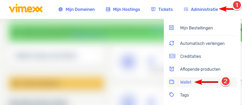 Om je GreenIQ Wallet op te waarderen moet je ingelogd zijn in het klantenpaneel. Bovenin kun je via Administratie naar **Wallet** gaan.