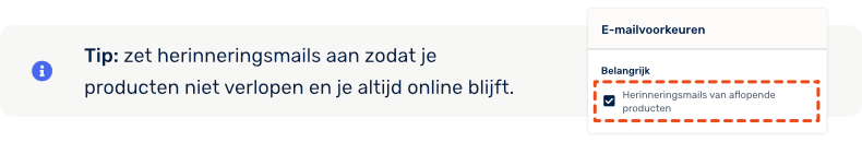 Het is mogelijk om je accountopties aan te passen, zoals het ontvangen van herinneringsmails van aflopende producten. Dit kun je wijzigen door te klikken op het poppetje rechtsboven