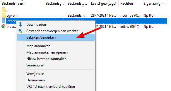 Er verschijnt nu een bestand genaamd .htaccess in de lijst met bestanden op de FTP server. Selecteer dit bestand, klik op de rechtermuisknop en selecteer dan View/edit of Bekijken/bewerken.