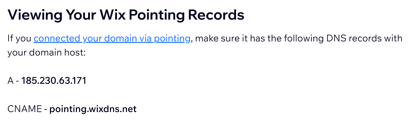 Log in bij WIX en ga naar de pagina DNS Records Needed to Connect Your Domain to Wix .