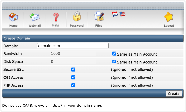 Zodra je hier op geklikt hebt, voer je de domeinnaam in die je eerder geregistreerd en dus gekocht hebt. De rest kun je eigenlijk in elk geval zo laten staan, tenzij je zelf weet wat je verandert. Daarna klik je op Create waarna de domeinnaam netjes toegevoegd is binnen je hosting pakket.