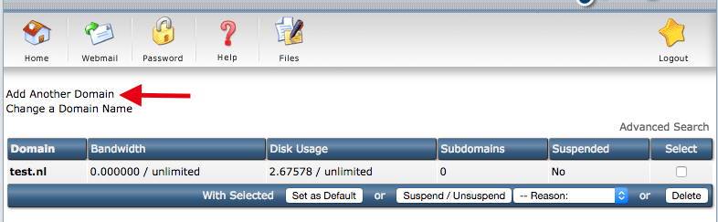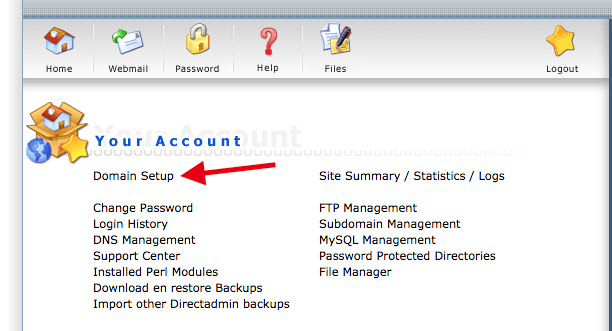 De eerste stap met het koppelen van een extern domein aan het hosting pakket, is het toevoegen van het domein binnen DirectAdmin. Dit doen we in DirectAdmin via het menu Domain setup welke je links bovenaan in DirectAdmin vind. Op onderstaande afbeelding staat het met een pijl aangegeven.