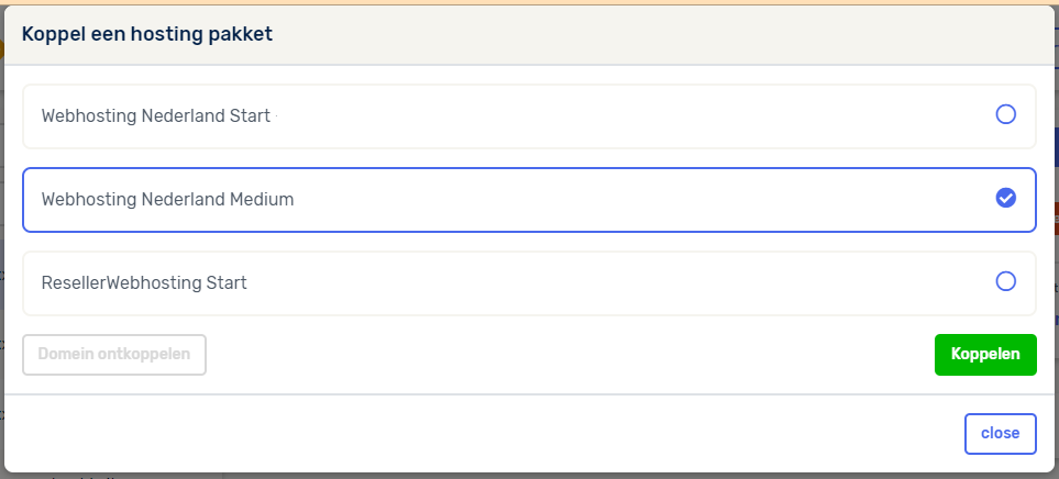 De volgende stap is het daadwerkelijk koppelen van je domeinnaam aan het hosting pakket, selecteer je pakket en klik vervolgens op Koppelen om je domeinnaam aan het pakket te koppelen.