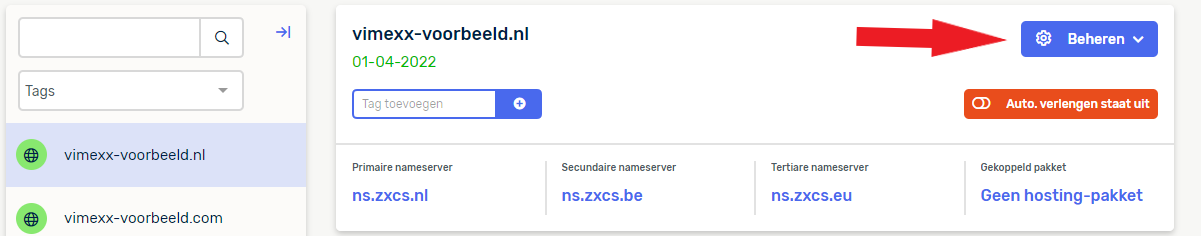 Hierna zie je aan de linkerkant een overzicht van je domeinnamen die bij ons geregistreerd staan. Klik de domeinnaam aan, waar je graag een hostingpakket aan wilt koppelen. Hierna klik je op de blauwe knop Beheren en vervolgens op Koppel een hostingpakket.