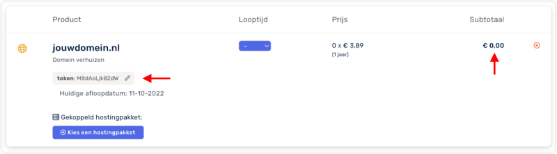 Zodra je domein is toegevoegd kan je naar de winkelwagen gaan om je verhuistoken (ook wel verhuiscode, transfercode of epp code genoemd) in te vullen.