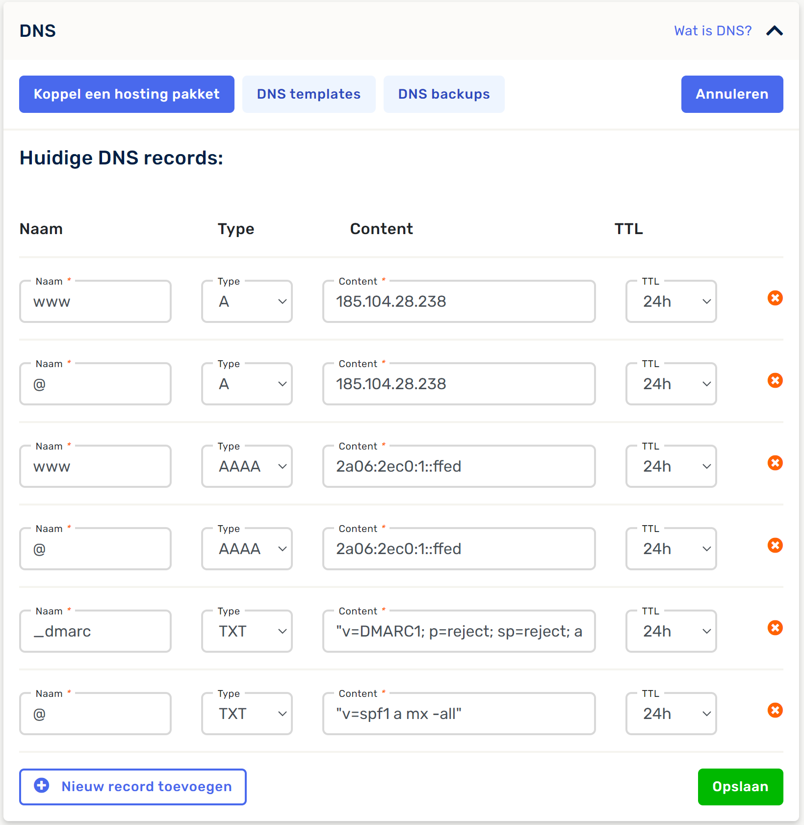 NS staat voor Nameserver en met dit record geef je de nameservers van je domeinnaam aan. Elk domein heeft minimaal twee NS-records. Deze NS records horen te matchen met de nameservers die gebruikt zijn voor het domein in het klantenpaneel van de hosting provider.