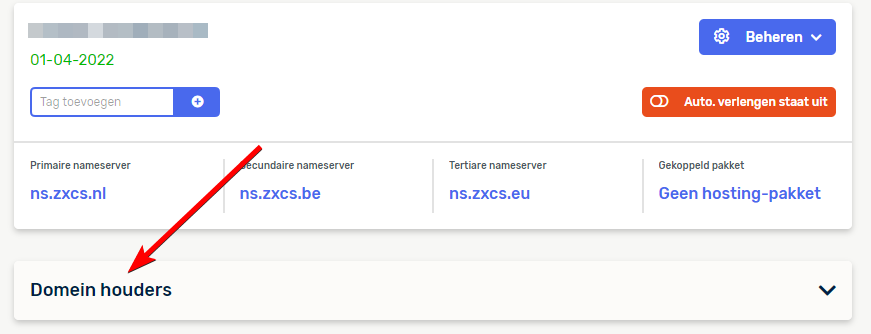 Hierna kun je in het midden van het scherm klikken op de balk Domein houders.