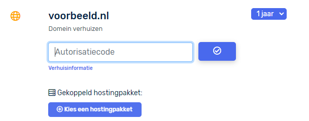 Je ziet dan in je winkelwagen de gekozen domeinnaam staan. Via de verhuistoken in als autorisatiecode en klik op het vinkje om deze te bevestigen.
