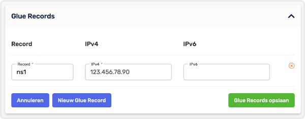 Soms kan het nodig zijn om Glue records in te stellen voor je domein. Glue records zijn IP adressen die je kan opgeven bij een nameserver. Een Glue record is nodig als je een nameserver wil gebruiken op een domeinnaam welke onderdeel is van dezelfde eerder genoemde nameserver.