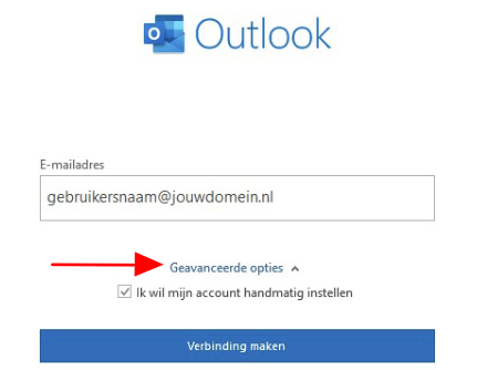 Vervolgens, kom je in een wizard voor het toevoegen van je e-mailadres. Hier klik je op “Geavanceerde opties“ en daarna op “Ik wil mijn account handmatig instellen”.