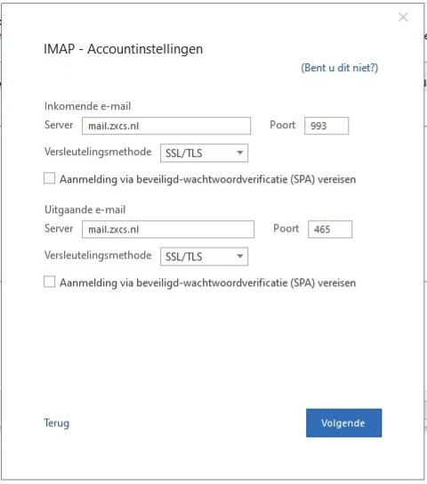 Daarna krijg je de accountinstellingen te zien. Deze kan je overnemen uit onze GreenIQ e-mail instellingen handleiding en lijken op de instellingen in de screenshot hierin. Zodra je dit gedaan hebt, klik je weer op volgende.