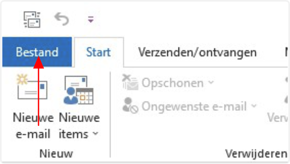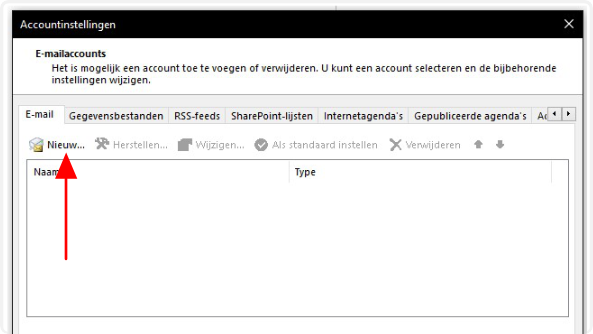 Als vervolgens klikken we op “Nieuw”. We starten op deze manier de wizard voor het toevoegen van het e-mailadres binnen je Outlook.