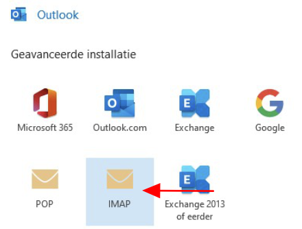 Daarna klik je op “POP“ of “IMAP”. In dit voorbeeld kiezen wij voor een IMAP koppeling.