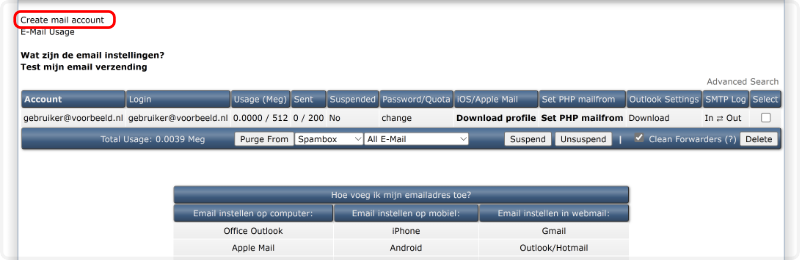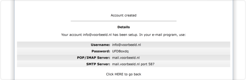 Nadat je dit hebt gedaan, krijg je een scherm met alle gegevens. Deze gegevens heb je nodig om het account in te kunnen stellen in een e-mailclient. Handleidingen over hoe je dat doet zijn te vinden bij de Helpdesk onder het kopje “Email”. We raden onze klanten aan om voor de SMTP en POP3 mailserver de volgende gegevens te gebruiken: Email instellingen IMAP - POP3 - SMTP .
