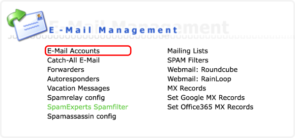 Je logt hiervoor in op de DirectAdmin omgeving waarvan je de inloggegevens na bestelling per mail hebt ontvangen. Houd deze gegevens goed bij de hand, want je zult ze altijd nodig hebben bij het aanmaken van e-mail en het beheren van je hosting! Zodra je bent ingelogd, klik je op de knop E-Mail Accounts, zoals in het plaatje hieronder te zien is.