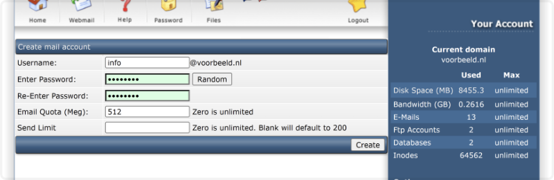Hier klik je op, gevolgd door het linkje ”Create mail account” welke je links bovenaan ziet staan op deze pagina. Hiermee kom je op de pagina waar je een e-mail account kunt aanmaken. Je krijgt nu een scherm te zien waar je zelf de gebruikersnaam (het stukje voor @domein.nl) en het wachtwoord van je eigen persoonlijke mailadres kunt invoeren. Ook het aantal te verzenden mails (Send Limit) en de opslagruimte (Email Quota) zijn hier in te stellen. In theorie hebben wij dit al voor je ingevuld en hoef je daar verder niet direct iets aan te wijzigen. Voor de opslagruimte (Email Quota) kan je een 0 aangeven zodat hier geen limiet bij word ingesteld indien je dat wenst.