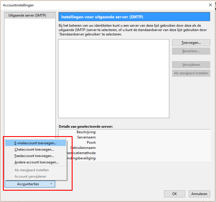 Er verschijnt nu een nieuw venster, bij dit venster kies “Account acties” en dan “Email account toevoegen”.