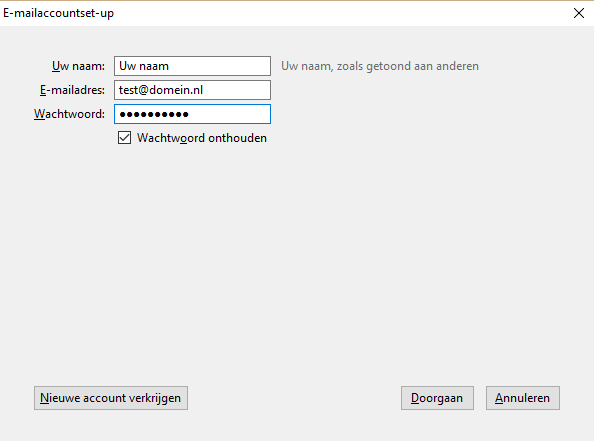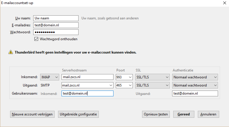 Mozilla Thunderbird zal waarschijnlijk aangeven dat er geen instellingen gevonden kunnen worden. Dit is geen probleem, nu moet je handmatig de gegevens invullen. In de afbeelding staat welke mailservers je kunt gebruiken! Een overzicht van alle gegevens vind je ook in het artikel Email instellingen en poorten voor IMAP - POP3 - SMTP .