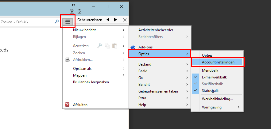 Allereerst start je je Mozilla Thunderbird op. Zodra het programma opgestart is klik bovenaan op de 3 horizontale streepjes. Je krijgt nu een menu waar je vervolgens naar opties → account instellingen gaat.