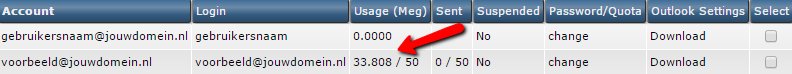 Je krijgt nu een overzicht van alle mailboxen te zien. Hierbij staat ook aangegeven hoeveel opslag per mailbox al in gebruik is.