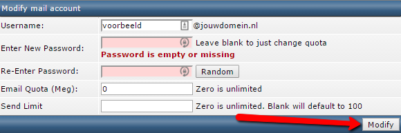 Wanneer je nu onder “Password/Quota” op “change” klikt kom je op de pagina terecht waar je je opslag en verstuur limiet kunt aanpassen. Wanneer je “onbeperkte” opslag voor je mailbox wilt voer je bij “Email Quota (Meg)” een 0 in. Op het moment dat je bij “Send Limit” niets invoert wordt automatisch de standaard waarde gebruikt. Het beheer ligt in jouw handen. Voor enkel een wijziging voor de mailbox grootte of het verstuur limiet zorg je er voor dat bij wachtwoord alles leeg is.