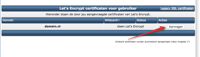 Nadat je dat gedaan hebt kom je op de SSL certificaat pagina uit. In de regel van elk domein zie je een optie om het Let's Encrypt certificaat aan te vragen. Dit kun je doen door op de knop “Aanvragen” te klikken.