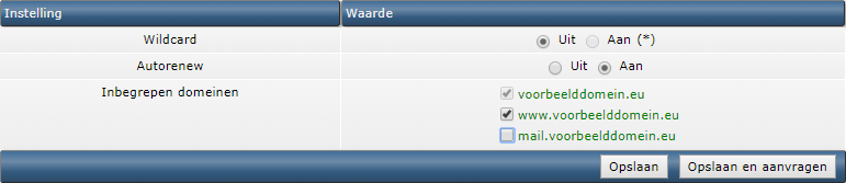 Pas de gegevens van je aanvraag aan, zodat deze voor jouw situatie geschikt is. Wanneer je nameservers niet naar ons staan, moet je hier Wildcard uit zetten.