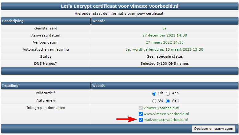 Klik het certificaat aan dat bij je domeinnaam hoort. Hier zou je moeten zien dat deze ook geldt voor mail.jouwdomeinnaam.nl