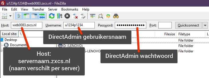 We hebben het FTP programma FileZilla geïnstalleerd. We openen nu het programma en gaan verbinden met FTP. Na het aanschaffen van je eigen webhosting pakket, heb je een email gehad met alle gegevens van het pakket. Hierin staat een hostname/adres, een gebruikersnaam en een wachtwoord vermeld. Deze voer je bovenaan in FileZilla in, zoals je ziet in het voorbeeld hieronder. Bij poort gebruiken we poort 21. Vervolgens klik je op verbinden.