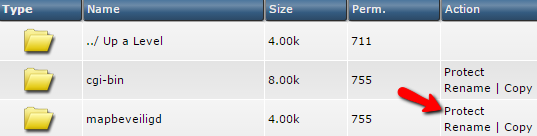 Je krijgt nu alle mappen en bestanden die in de public_html van je website staan te zien. Klik bij de map dat beveiligd dient te worden op “Protect”. In het voorbeeld willen wij “mapbeveiligd” beveiligen met een wachtwoord.