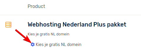Je komt nu in de winkelwagen terecht, ga nu naar de **domeinnaam** pagina, de link vind je bovenaan onze website of klik door via het tandwieltje voor de regel Kies je gratis NL domein.