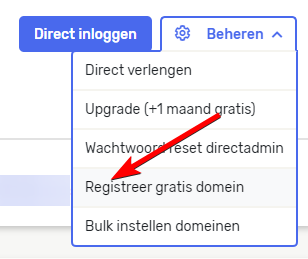Vervolgens krijg je het overzicht van al je hosting pakketten te zien, klik bij het hosting pakket wat je net hebt afgenomen op de blauwe knop Beheren. Je krijgt nu alle opties voor het hosting pakket te zien. Klik op Registreer gratis domein.