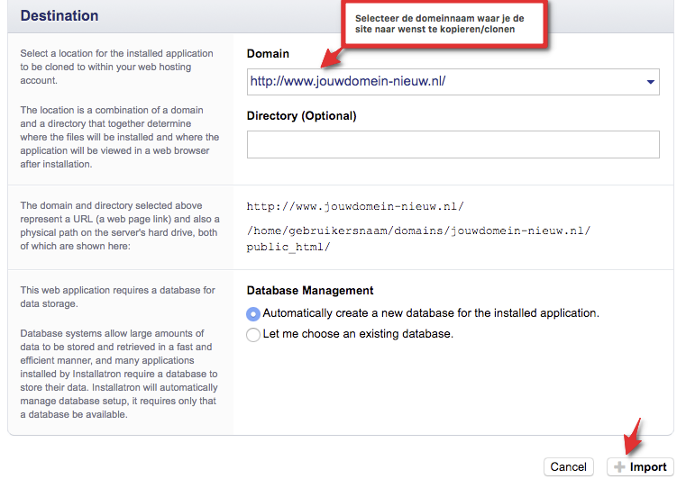 Bij “Destination” selecteer je de domeinnaam waar de site naar gecloned dient te worden. Waarna je vervolgens op “Import” klikt om het proces te starten.