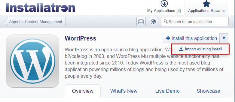 Nu komen we in het installatie menu van installatron, in plaats van dat we nu op “install this application” klikken, klikken we op het pijltje ernaast. Je krijgt een optie eronder met “import existing install”, hier klikken we op.