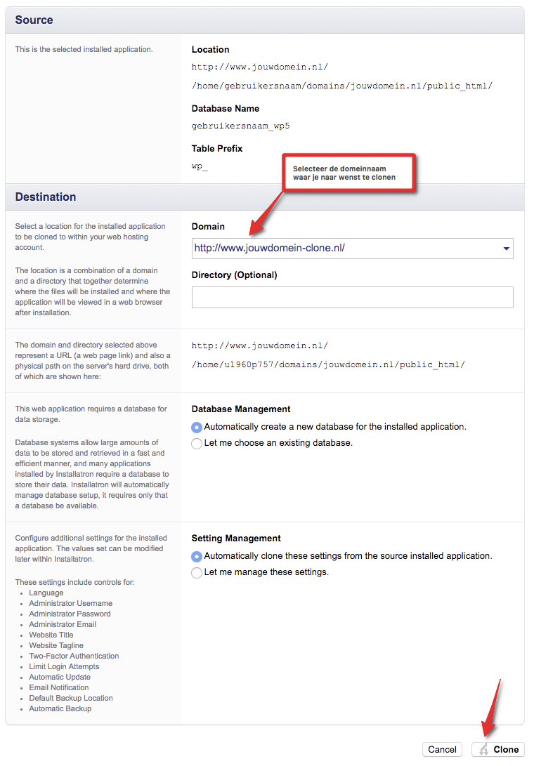 Je komt op een nieuw scherm terecht waar je de domeinnaam waar je naar toe wenst te kopieren kunt selecteren en ook het pad kunt aangeven, je selecteert de nieuwe domeinnaam en wist eventueel het veld bij “Directory (Optional)” om te installeren op je hoofddomein waarna je daarna klikt op “Clone” om het proces te starten. Mocht de domeinnaam niet in het rijtje staan dan dien je deze eerst toe te voegen in DirectAdmin, gebruik hiervoor de handleiding .