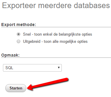 Zodra je dat gedaan hebt klik je in het menu op “Exporteren”. Klik daarna op “Starten” om een dumpbestand te downloaden.