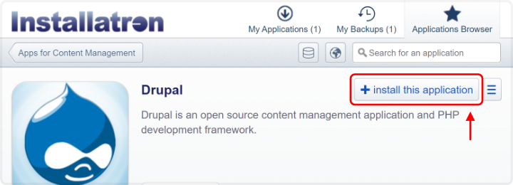 Daarna krijg je de mogelijkheid om Drupal te installeren. Klik hiervoor op “install this application”.