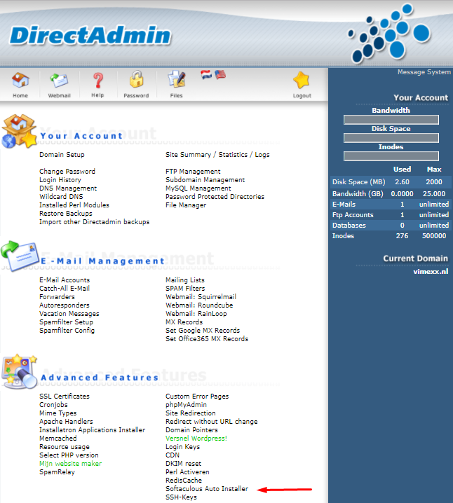 Om Magento te installeren via Softaculous dien je naar je DirectAdmin paneel te gaan. De link naar dit paneel staat beschreven in de email die je na de aanschaf van een webhosting pakket van ons hebt ontvangen!