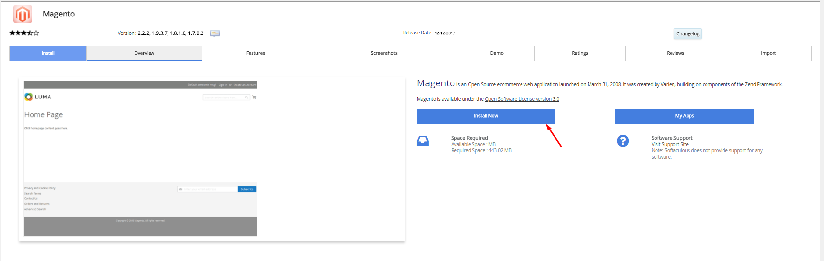Daarna krijg je de mogelijkheid om Magento te installeren. Klik hiervoor op “Installeer”.
