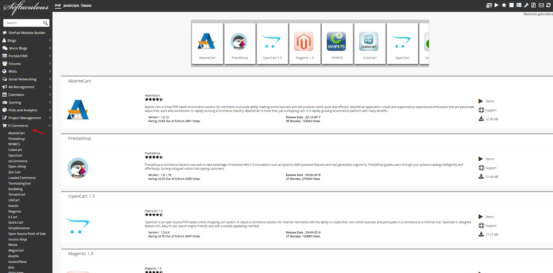 Je krijgt nu een overzicht van alle beschikbare applicaties te zien. Klik links in het menu op “E-Commerce”.