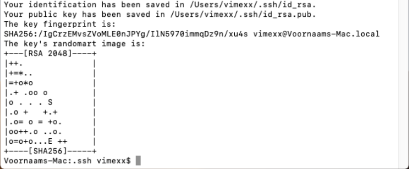 Na het tweemaal invoeren van je passphrase, wordt de sleutel aangemaakt. Je zou dan ongeveer hetzelfde moeten zien als in het bovenstaande voorbeeld.
