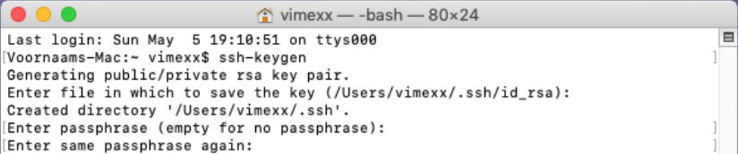 ssh-keygen Waarna eerst wordt gevraagd waar je de sleutel wilt opslaan. De standaard locatie is prima, dus hier drukken we gewoon op Enter. Daarna moet je een “passphrase” invoeren. Hier kan je een wachtwoord aanmaken waarmee jouw sleutel beveiligd is. Dit is niet verplicht, maar wel aangeraden.