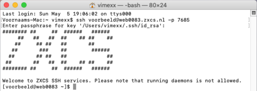 ssh gebruikersnaam@server -p 7685 Hierin moeten gebruikersnaam en server vervangen worden met jouw gegevens. In het bovenstaande voorbeeld is de user dus “voorbeeld”.