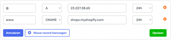Klik nu 2 keer op de knop Nieuw record toevoegen. Shopify vereist voor de koppeling namelijk 2 DNS records. Stel bij deze regels de A en CNAME record van Shopify in. Deze zijn als volgt: