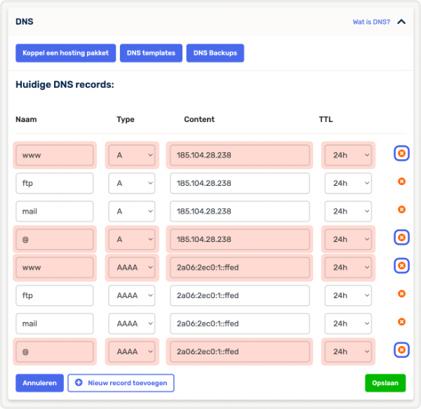 2. Verwijder A en AAAA records