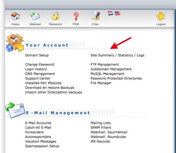 Om het log bestand te bekijken, gaan we naar ons DirectAdmin controlepaneel welke je ontvangen hebt na het aanschaffen van je webhosting pakket. Eenmaal ingelogd in DirectAdmin, zie je bovenaan site summary statistics logs staan, zoals hieronder in de afbeelding. Daar klik je vervolgens op.