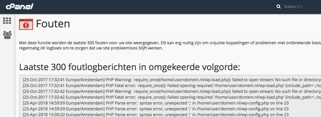 Om het log bestand te bekijken van je cPanel hosting, dien je in te loggen op je cPanel. Je krijgt direct een overzicht met allerlei opties en mogelijkheden. Dan zoek je naar het onderdeel “Fouten” of “Errors”.
