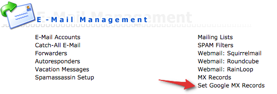 Als je inlogt in directadmin zie je onder “E-mail management” een linkje staan “Set Google MX Records”.